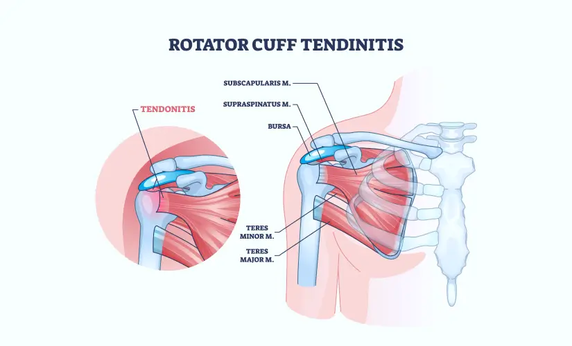 Your shoulder tendons can become swollen and painful, resulting in rotator cuff tendinitis. The rotator cuff has four muscles that keep your shoulder joint stable and help you move your arm, especially overhead. You won't notice this condition right away—it develops slowly as your tendons experience repeated stress. The bursa, a small fluid-filled sac that cushions your joint, often becomes inflamed among other tendons.