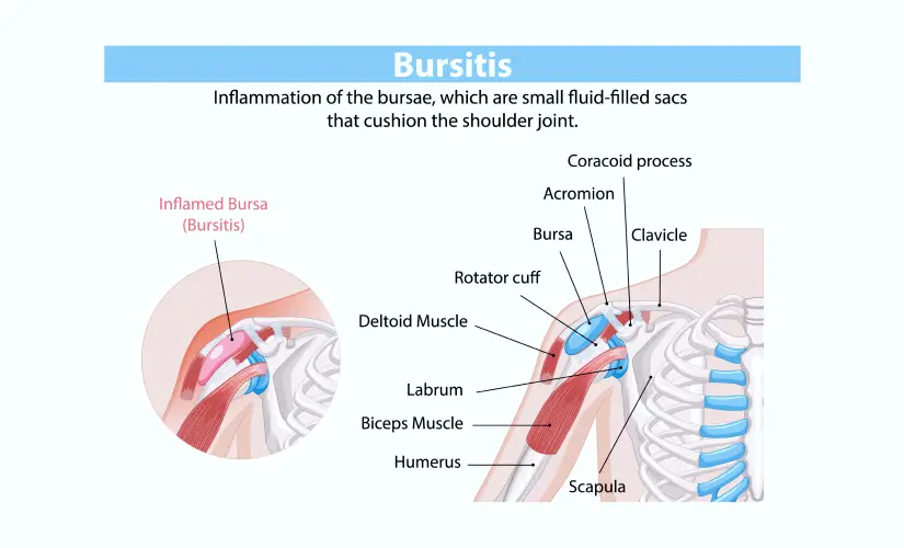 Shoulder bursitis (or rotator cuff bursitis) is a major cause of shoulder pain that affects people across all age groups. The rotator cuff has four key muscles that work collectively to control shoulder movement: supraspinatus, infraspinatus, teres minor, and subscapularis (SITS). Shoulder bursitis happens when small sacs filled with fluid, or bursae, that cushion your shoulder joint swell up and get inflamed. This article explains what shoulder bursitis is and its causes, treatments, and prevention strategies.