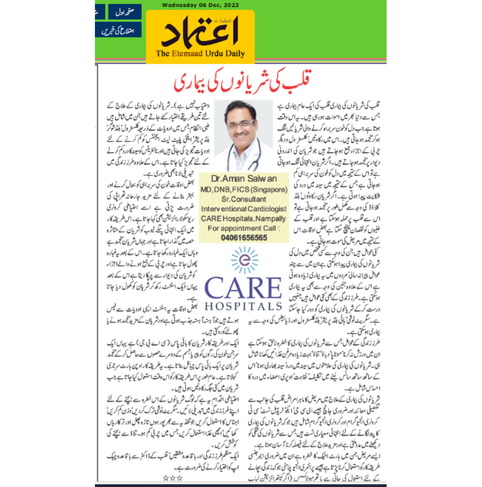 Article on Heart Problems by Dr Aman Salwan Consultant Cardiologist CARE Hospitals Nampally in The Etemaad Urdu Daily