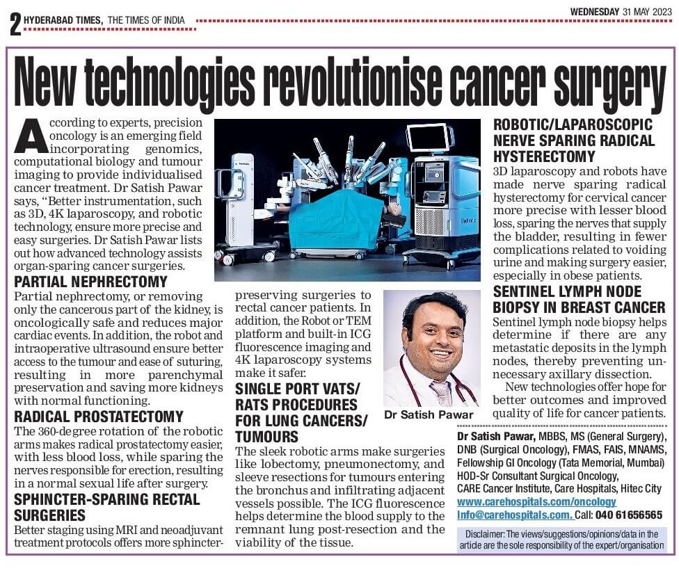 Article on Robotic Cancer Surgeries by Dr. Satish Pawar Sr. Consultant Surgical Oncologist CARE Hospitals, Hitech City