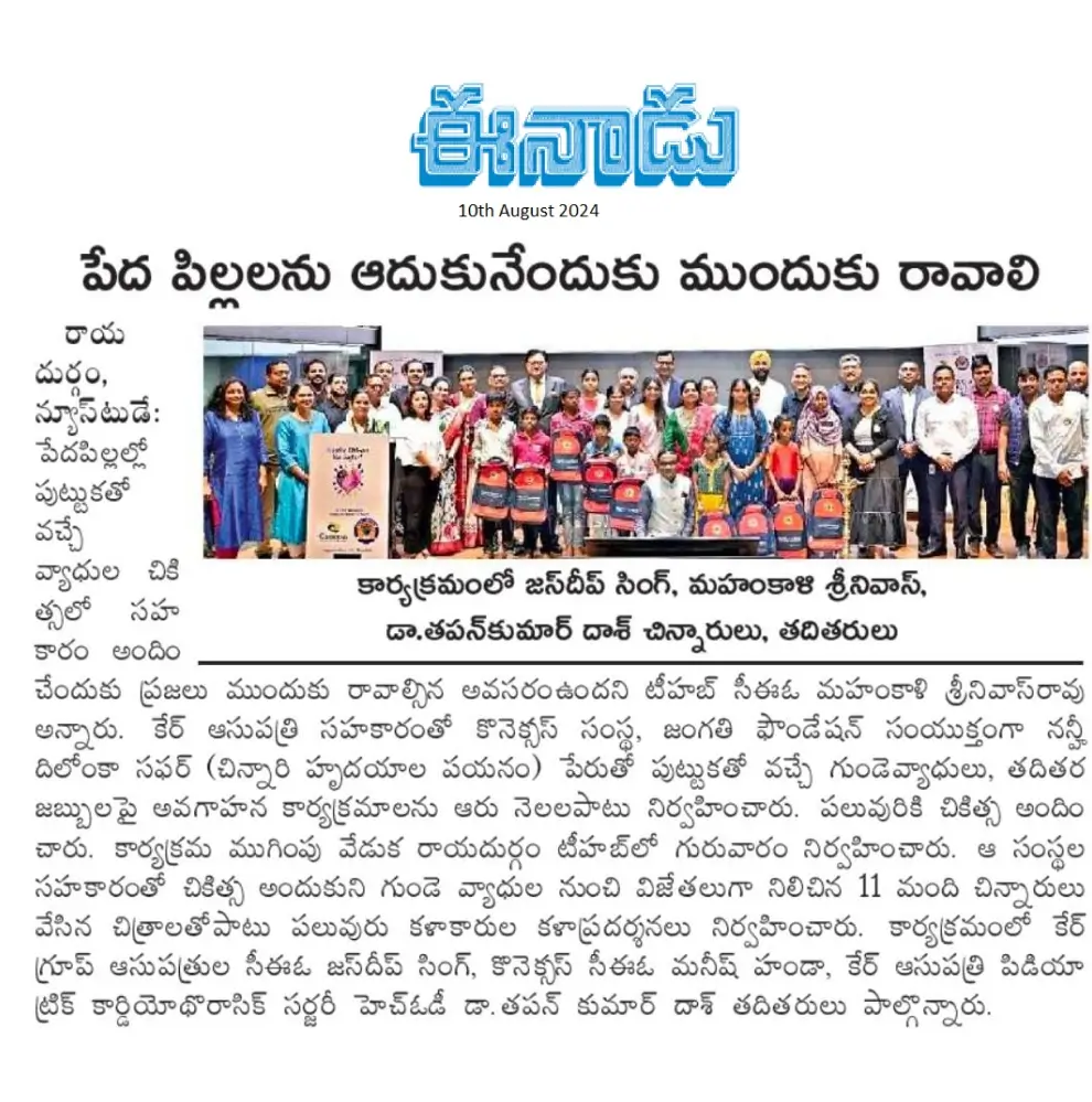 CARE Hospitals CSR Initiative to Treat Congenital Heart Disease Children Concludes Ceremony, News Coverage in Eenadu