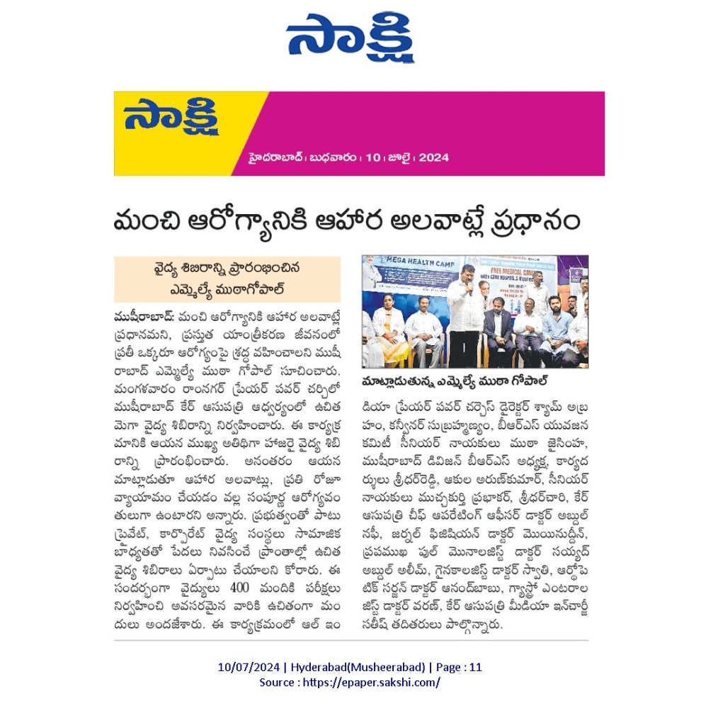 CARE Hospitals Musheerabad Organized Free Megha Health Camp at Ramnagar Prayer Power Church News Coverage in Sakshi