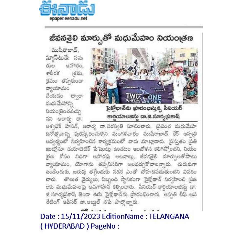 Cyclothan by CARE Hospitals Musheerabad On the occassion of World Diabeties Day News Coverage in Eenadu on 15th Nov 2023