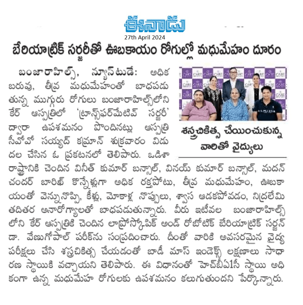 Diabeties Reversal in High BMI by CARE Hospital Doctors News Coverage in EEnadu