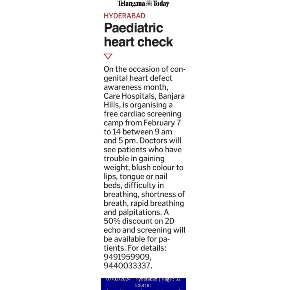 Free Paediatric Heart Check Camp at CARE Hospitals Banjara Hills News Coverage in Teleangana Today