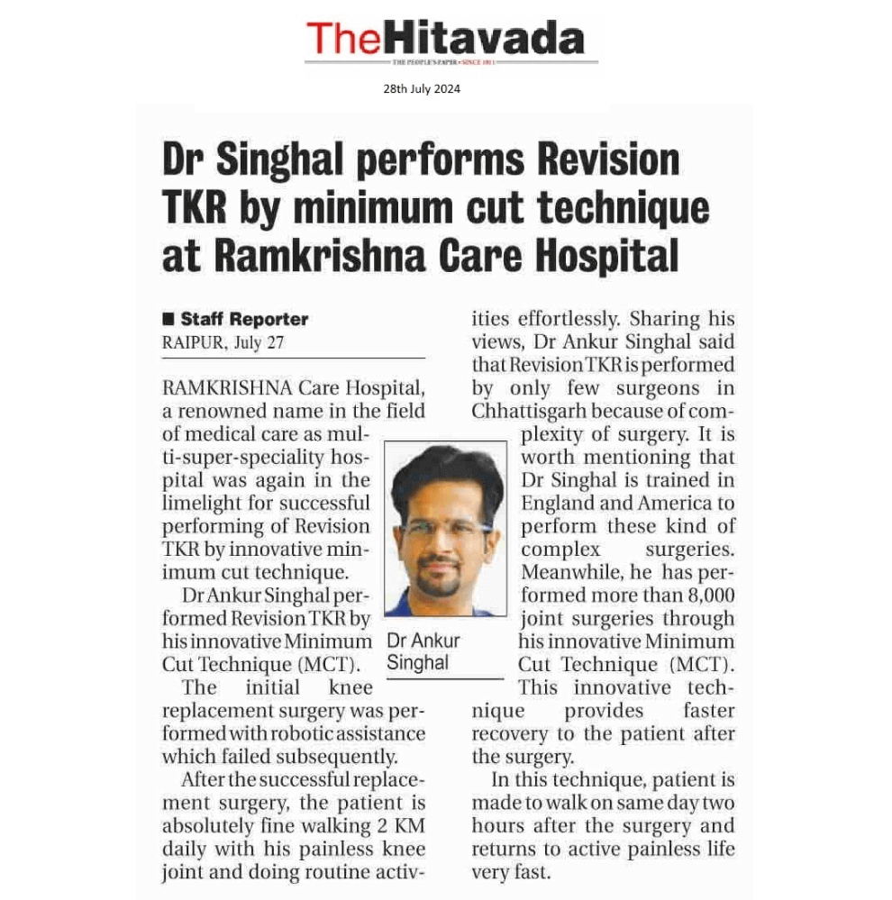 Ramakrishna CARE Hospitals Dr Singhal performs Revision TKR by minimum cut technique News Coverage in The Hitwada