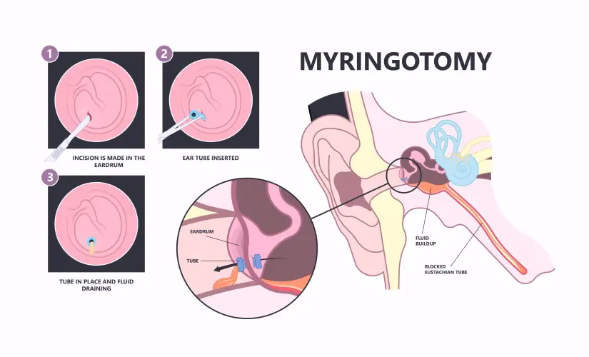 A myringotomy creates a small incision in your eardrum to drain fluid from the middle ear. Many doctors refer to this as ear tube surgery because it relieves pressure from fluid buildup.