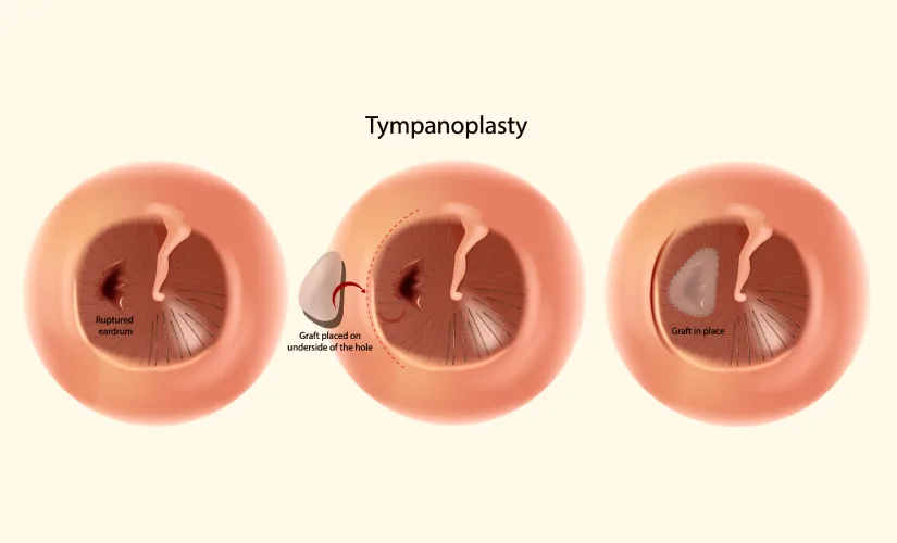 Tympanoplasty is the surgical closure of a perforation in the tympanic membrane, or eardrum, and the restoration of the normal hearing function. During tympanoplasty surgery, the tympanic membrane and the ossicles are repaired as indicated.